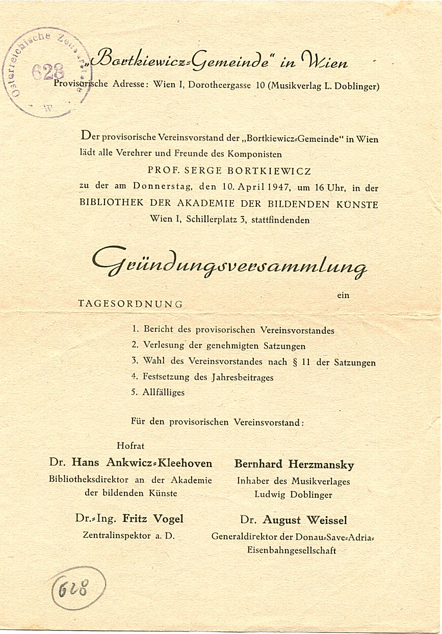 Shortly after the second World War Dr. Hans Ankwicz-Kleehoven (1883-1962) took the initiative to found the Bortkiewicz Gemeinde (Bortkiewicz Society).
