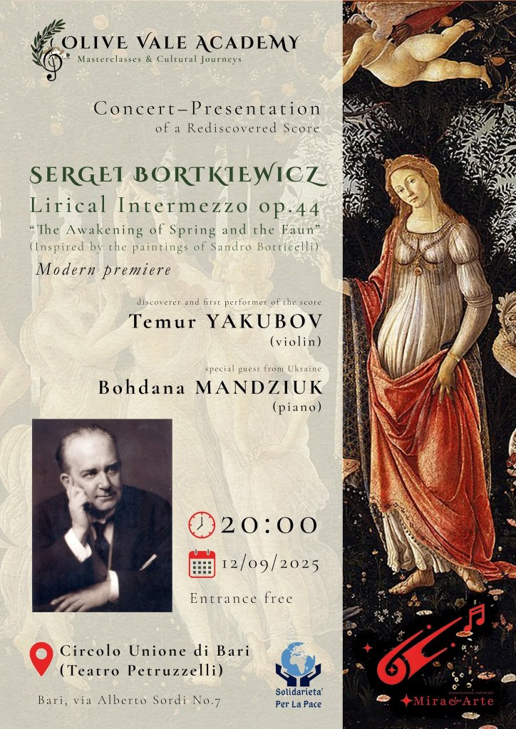 Today Temur Yakubov (violin) and Bohdana Mandziuk (piano) will perform Sergei Bortkiewicz’s Lyrical Intermezzo opus 44 (“The Awakening of Spring and the Faun”, inspired bu the paintings of Sandro Botticelli). Temur Yakubov discovered last year the violin and piano reduction of the full score for violin and orchestra, which is still lost. This is a world premiere performance.