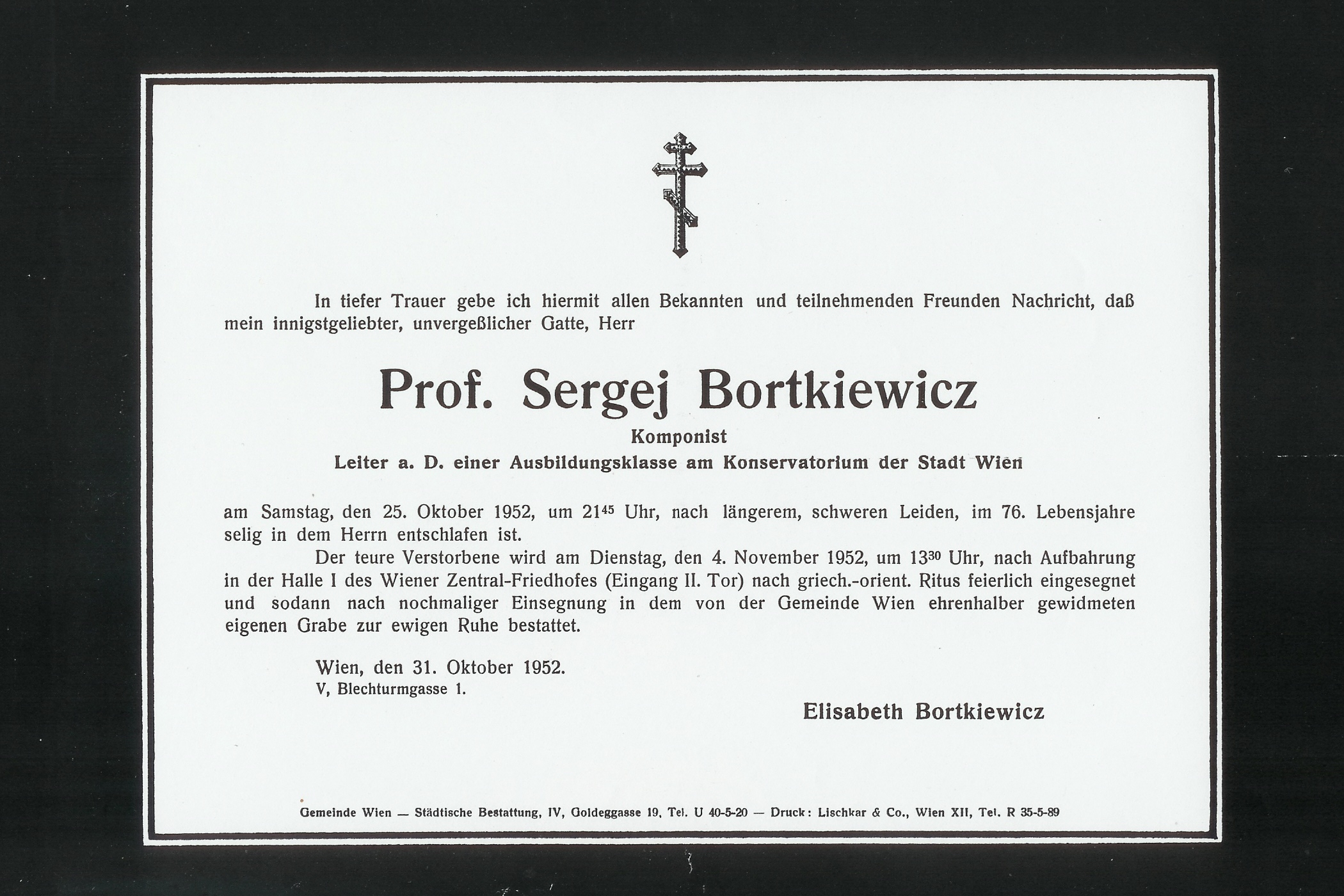 His wife, Elisabeth Bortkiewicz-Geraklitova was his sole heir. The Bortkiewicz Gemeinde tried to keep the memory of Bortkiewicz’ music alive. Elisabeth Bortkiewicz stayed as subtenant of Maria Cernas in the Blechturmgasse 1 Tür 5. On 9 March 1960 Elisabeth Bortkiewicz died in the Willergasse 24, Rodaun, Wien (Vienna). Her heirs were two daughters of her brother Sergei Ilyanko. Elisabeth Schubert-Tscharré and Grete Schuster received a legacy.
